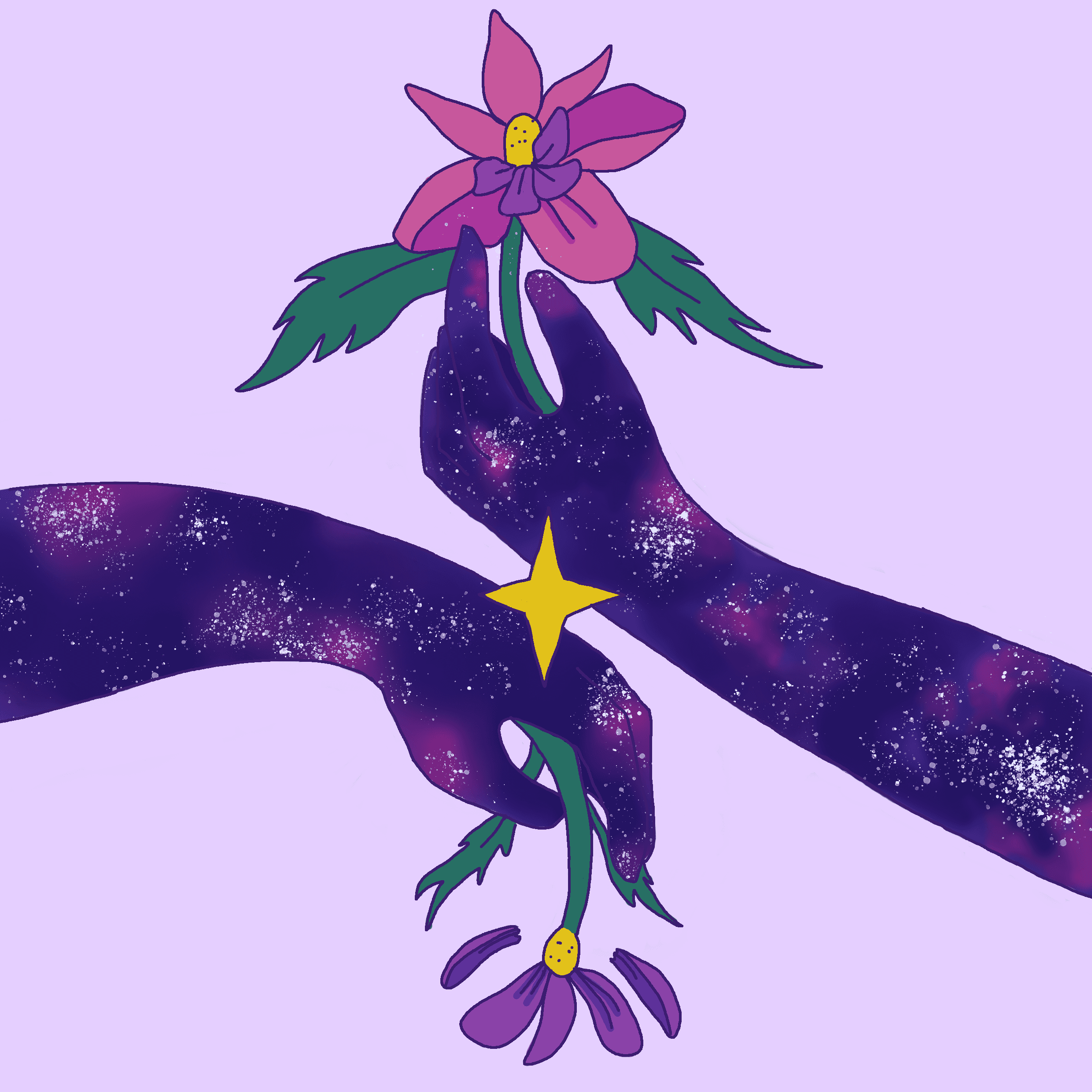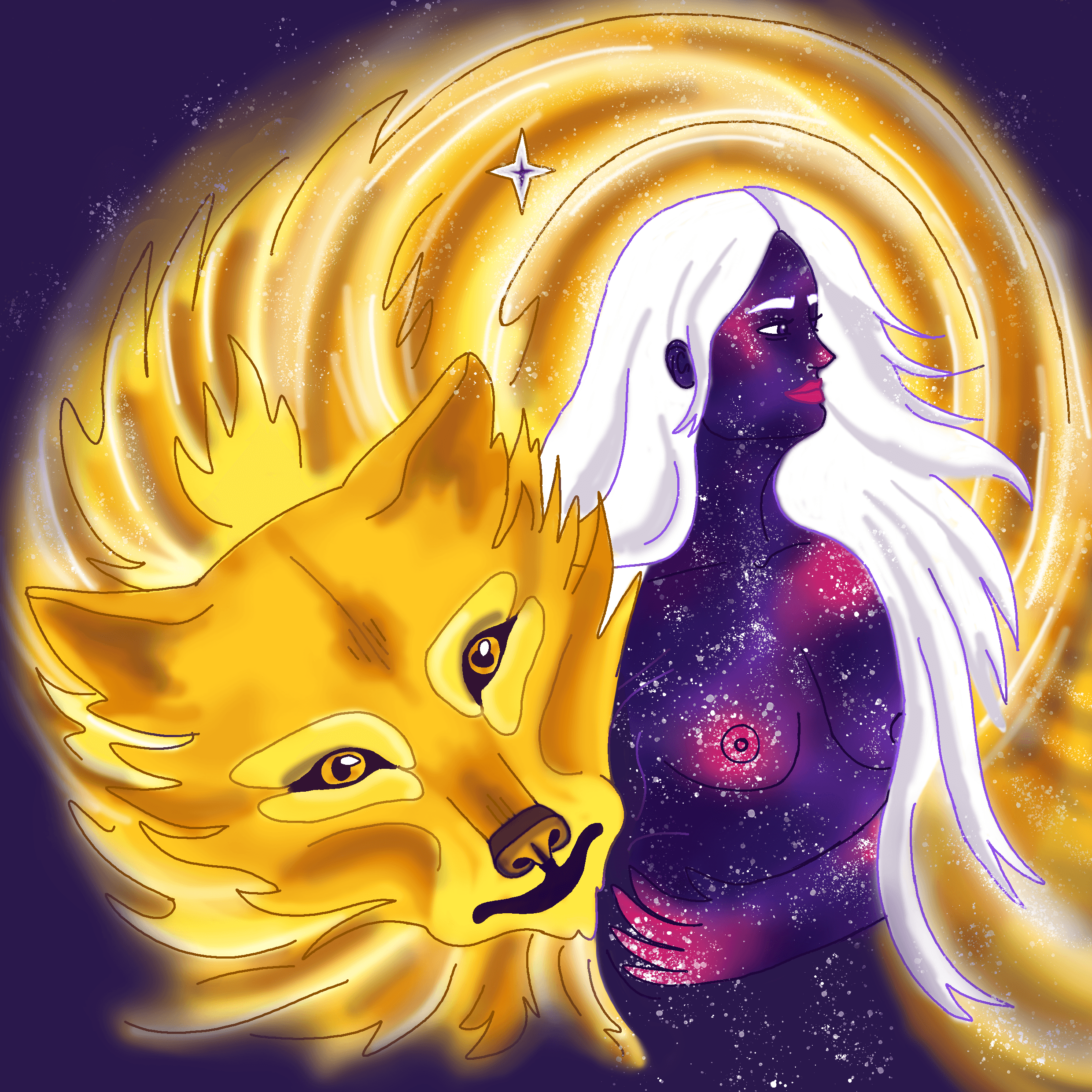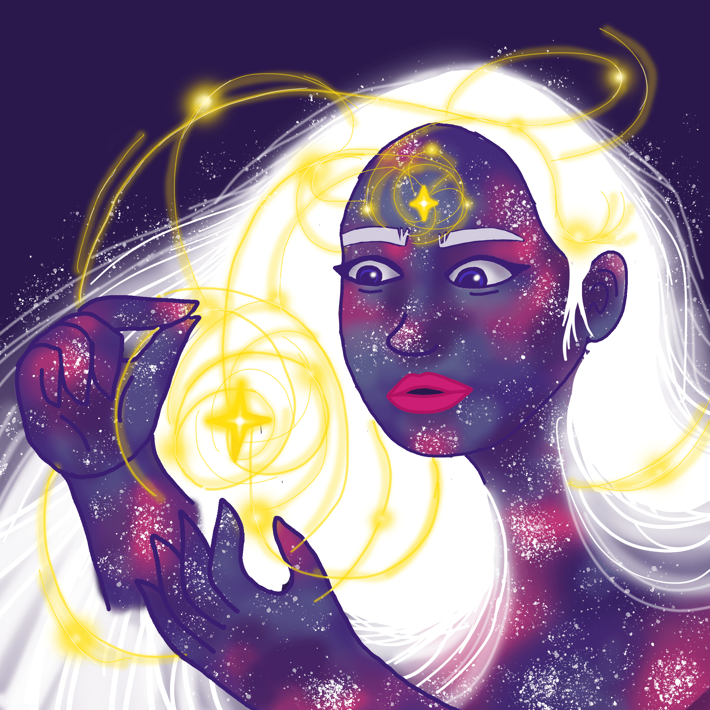 I used the theme of the universe to give my illustrations a dreamy magical dimension , with a repeating main character - the embodiment of the universe in a female form.